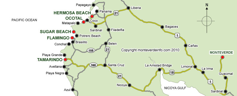 - Drive from Monteverde, head south for 33 km until you get to the Pan-American Highway. In the road, you must pass through the towns of Guacimal and Sardinal.